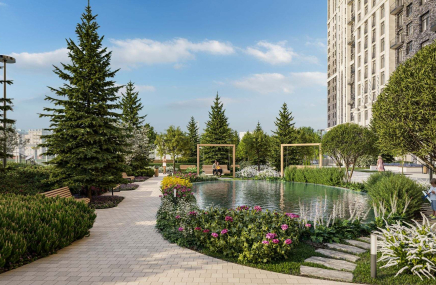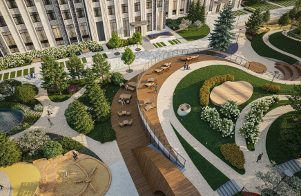 На территории проекта создан ландшафтный двор, площадью 1,7 га. Благодаря оригинальному рельефному решению двор превратился в тихий зеленый оазис, скрытый от шума улиц. Центр притяжения жителей — общественная гостиная с террасой под открытым небом, аналогов которой нет ни в одном дворе Москвы. Пока дети осваивают развивающую игровую площадку, взрослые могут отдохнуть и пообщаться с соседями в гостиной.