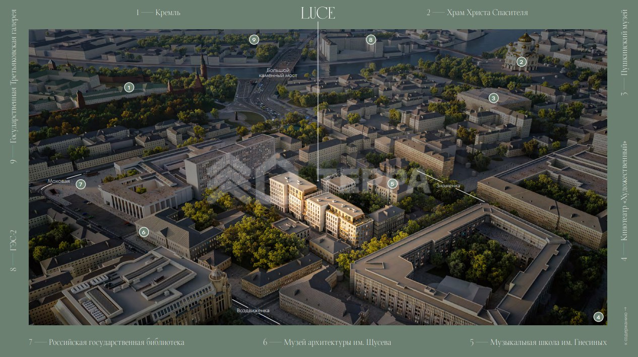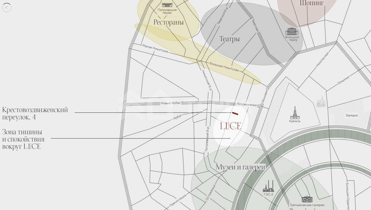 Дом расположен внутри Бульварного кольца. В пешей доступности: Театры, концертные залы, музеи, галереи. В окружении дома самые знаменитые здания: Кремль, Дом Пашкова, Библиотека им. Ленина, Гастрономическая Мекка, в 10 минутах пешком: Большая Никитская — Патриаршие пруды.