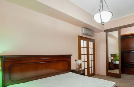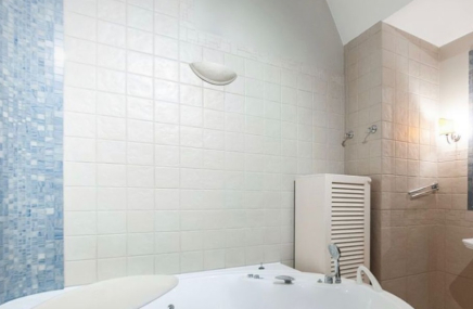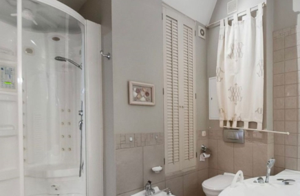 - ванная комната с ванной и большой душевой.В отделке использованы дорогие качественные материалы: натуральный дубовый паркет в укладке «французская елка»