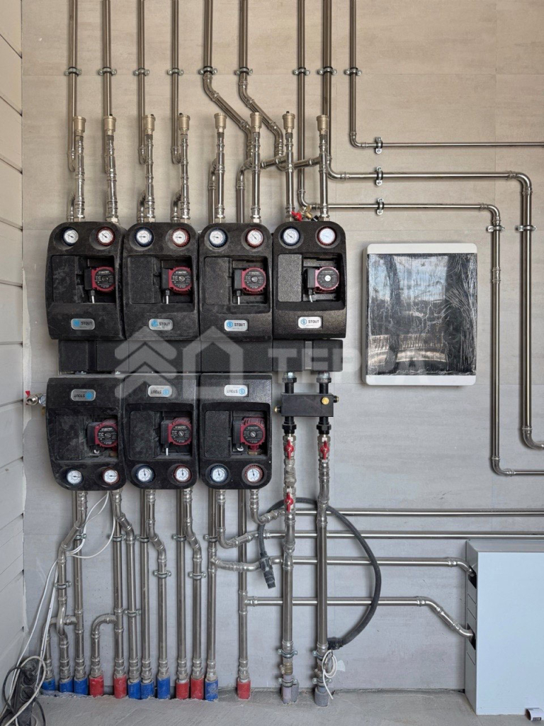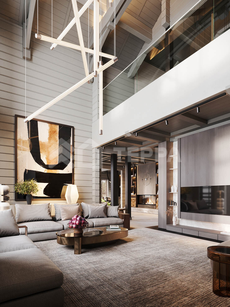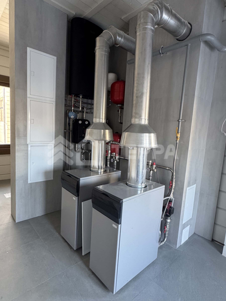 В доме: двухсветная гостиная, столовая, каминная, кухня с большой кладовой, 4 спальни, кабинет, 5 санузлов (в каждой спальне свой санузел+гостевой), крытая терраса. Мастер-спальня с гардеробом, ванной комнатой и приватной террасой на первом этаже. Современные инженерные коммуникации, система увлажнения и приточно-вытяжной вентиляции, подогрев дорожек на участке. Электричество и газ по прямым договорам. Гараж на 2 автомобиля, котельная с газом, апартаменты для помощников. Два въезда на участок, парковка для 4 авто.