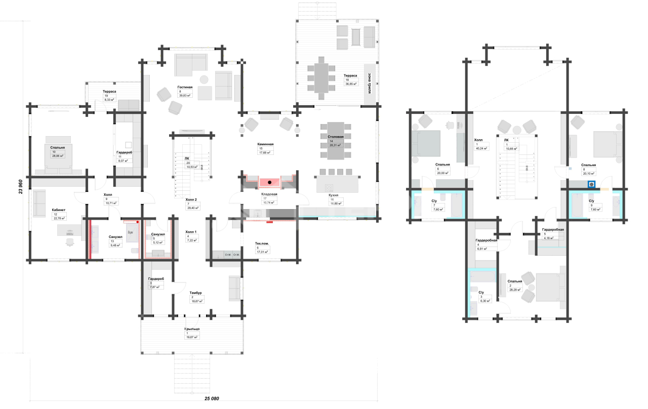 - мастер блок: спальня, гардеробная, ванная комната, терраса