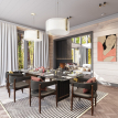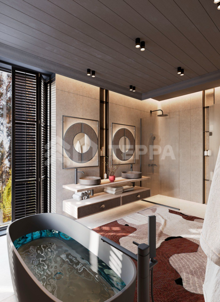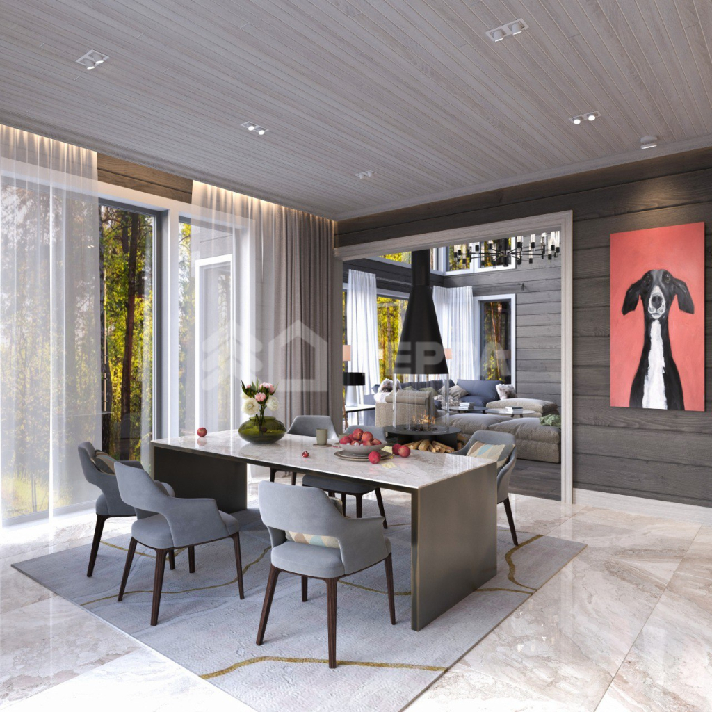 Планировкой предусмотрены: тамбур, просторная прихожая с гардеробом, что необходимо для загородного жилья и нашего климата; залитая лучами солнца через панорамные окна зона гостиной; эргономичная зона столовой с отдельным входом для вашего удобства; двусторонний камин для длинных зимних вечеров и бокала любимого вина; 5 больших шумоизолированные друг от друга спальни, каждая из которых располагает своим гардеробом и ванной комнатой; отдельная зона технического помещения для хранения, стирки и глажки. Выход из гостиной зоны на открытую террасу, которая прекрасна в любой сезон.