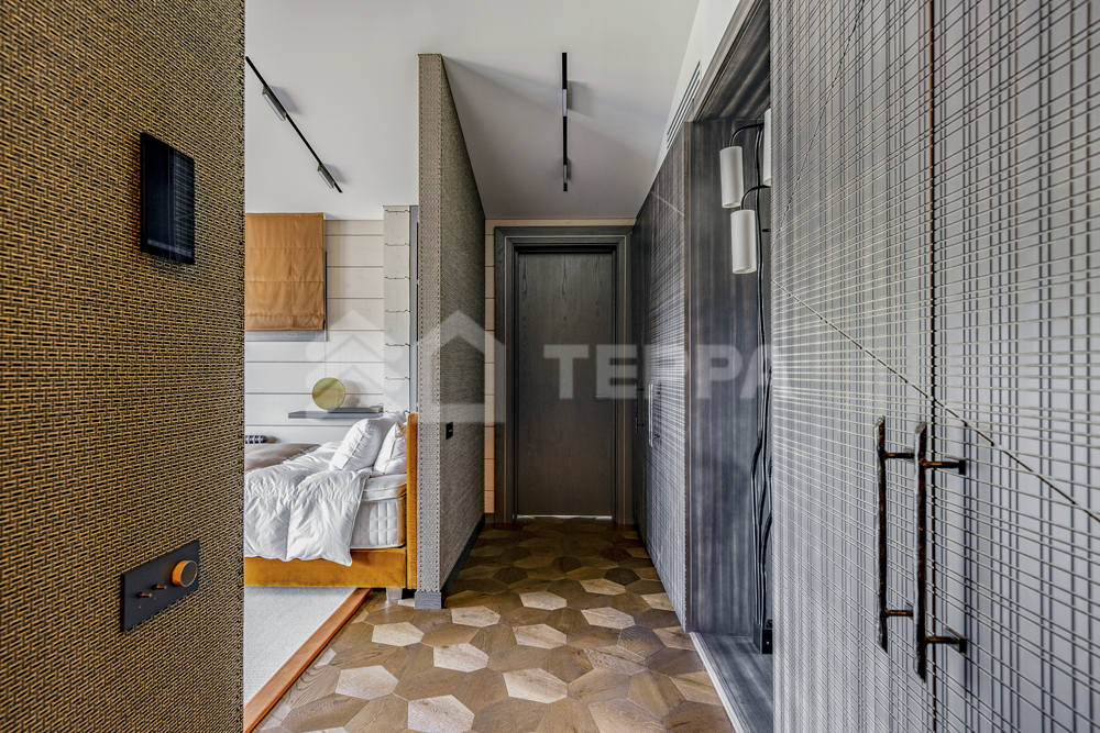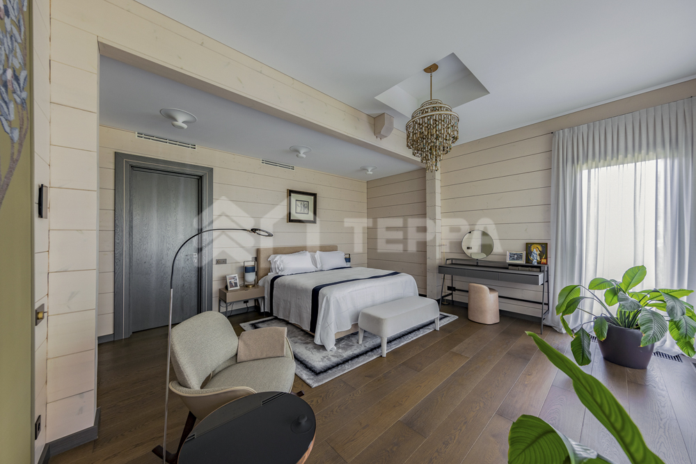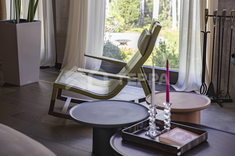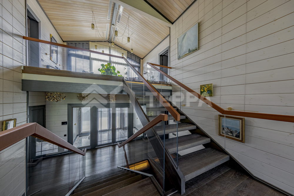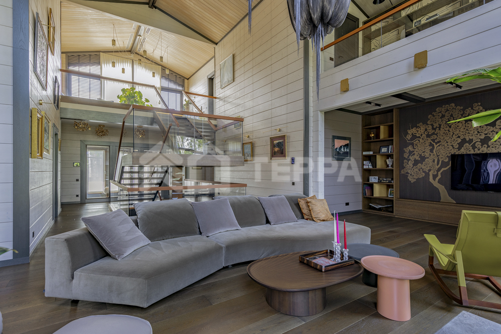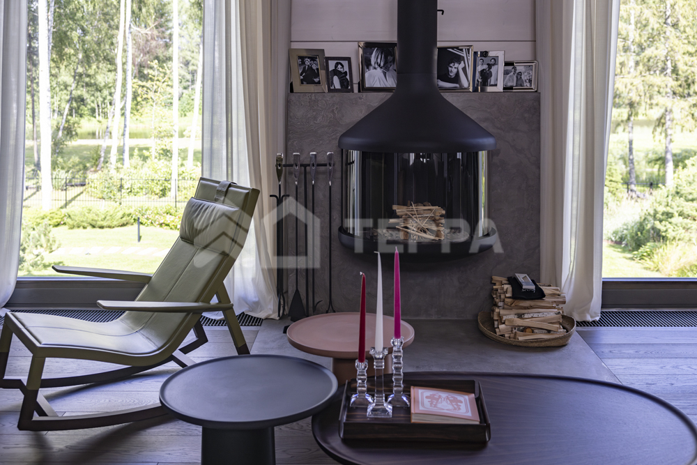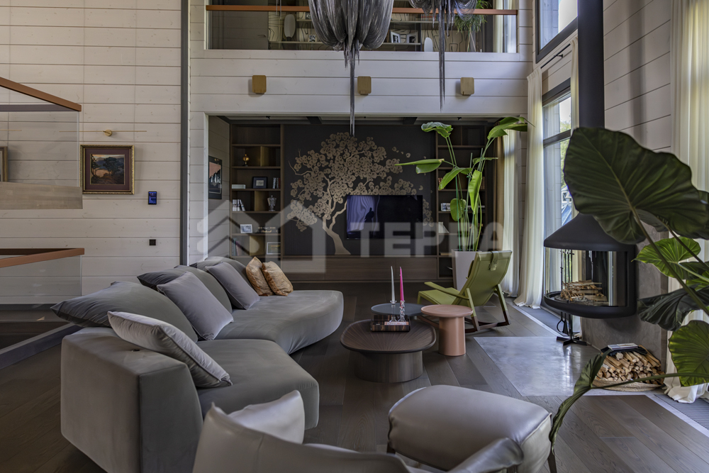 Интерьер дома воплощает стиль хюгге, наполненный уютом и теплом. Натуральные материалы, такие как мрамор Antique Brown и Black Storm, инженерная доска Либрон Arte Tech и мозаика Roma Diamond, сочетаются с мягкими оттенками. Сауну украшает канадский кедр и стена из гималайской соли. Необычные акценты, такие как дверной проем в форме замочной скважины и декоративные элементы, включая авторскую ширму с яблонями от Ольги Соловьевой, придают интерьеру уникальность и подчеркивают его природную концепцию.