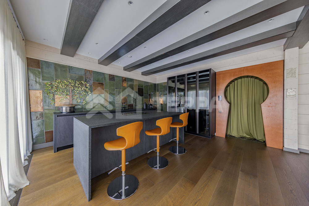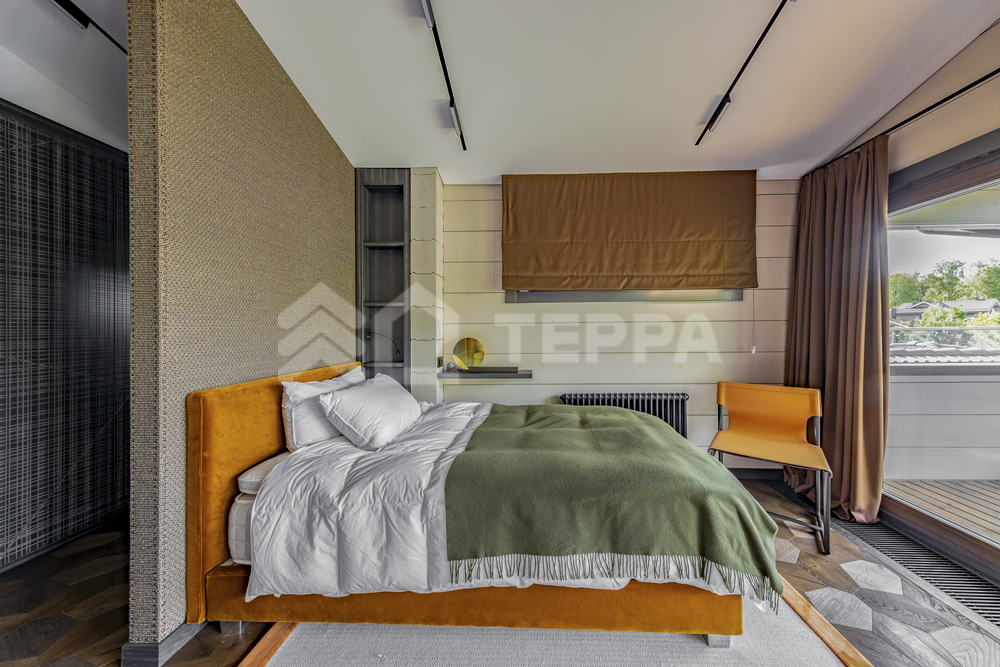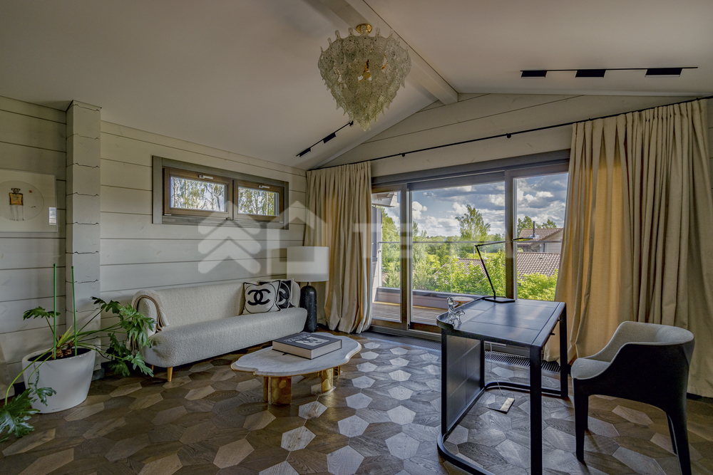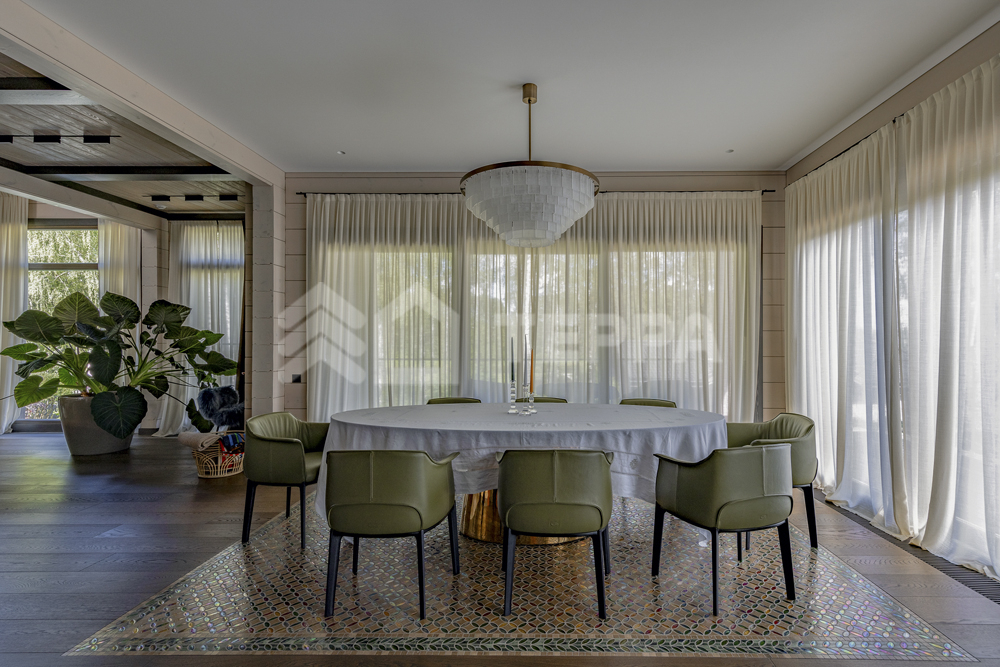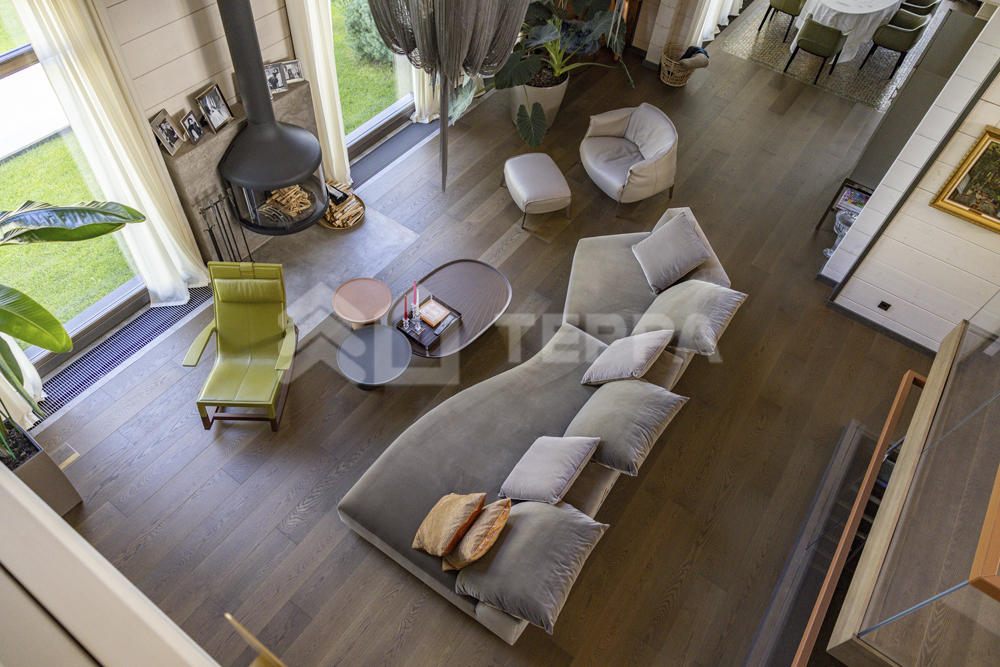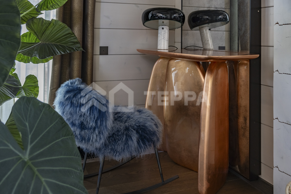 Интерьер дома воплощает стиль хюгге, наполненный уютом и теплом. Натуральные материалы, такие как мрамор Antique Brown и Black Storm, инженерная доска Либрон Arte Tech и мозаика Roma Diamond, сочетаются с мягкими оттенками. Сауну украшает канадский кедр и стена из гималайской соли. Необычные акценты, такие как дверной проем в форме замочной скважины и декоративные элементы, включая авторскую ширму с яблонями от Ольги Соловьевой, придают интерьеру уникальность и подчеркивают его природную концепцию.