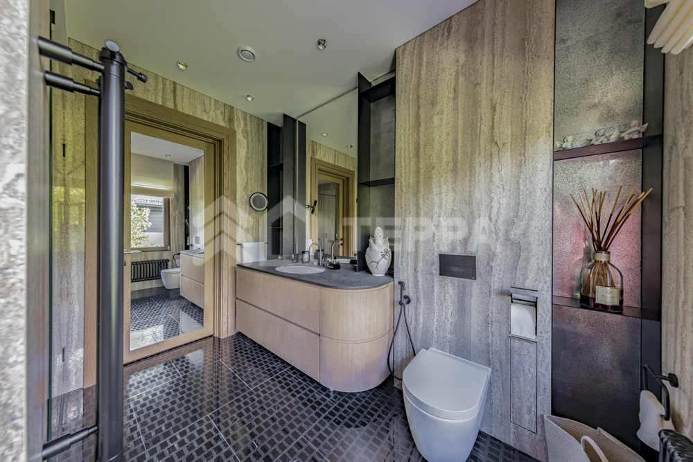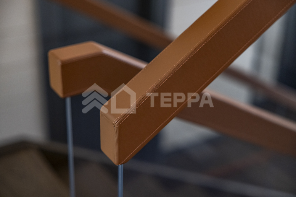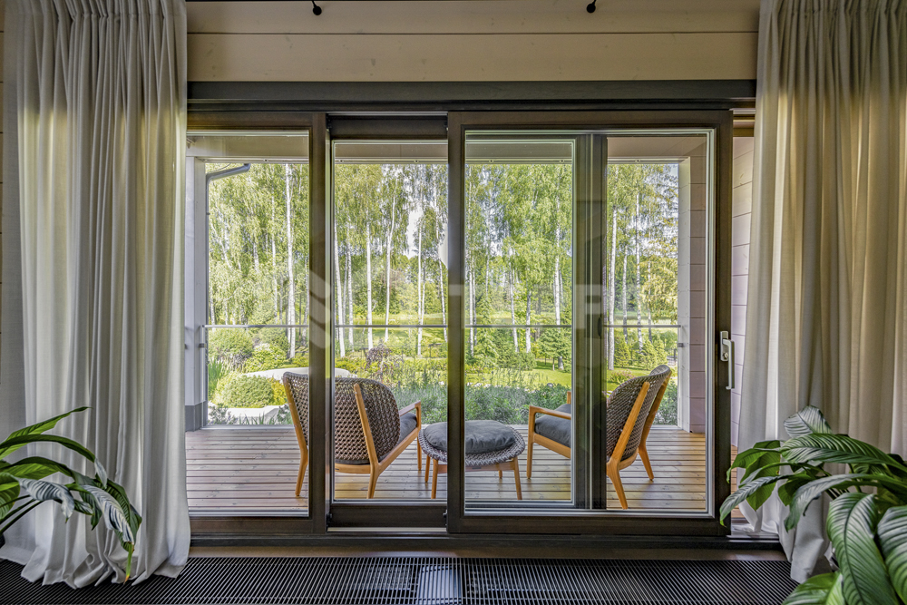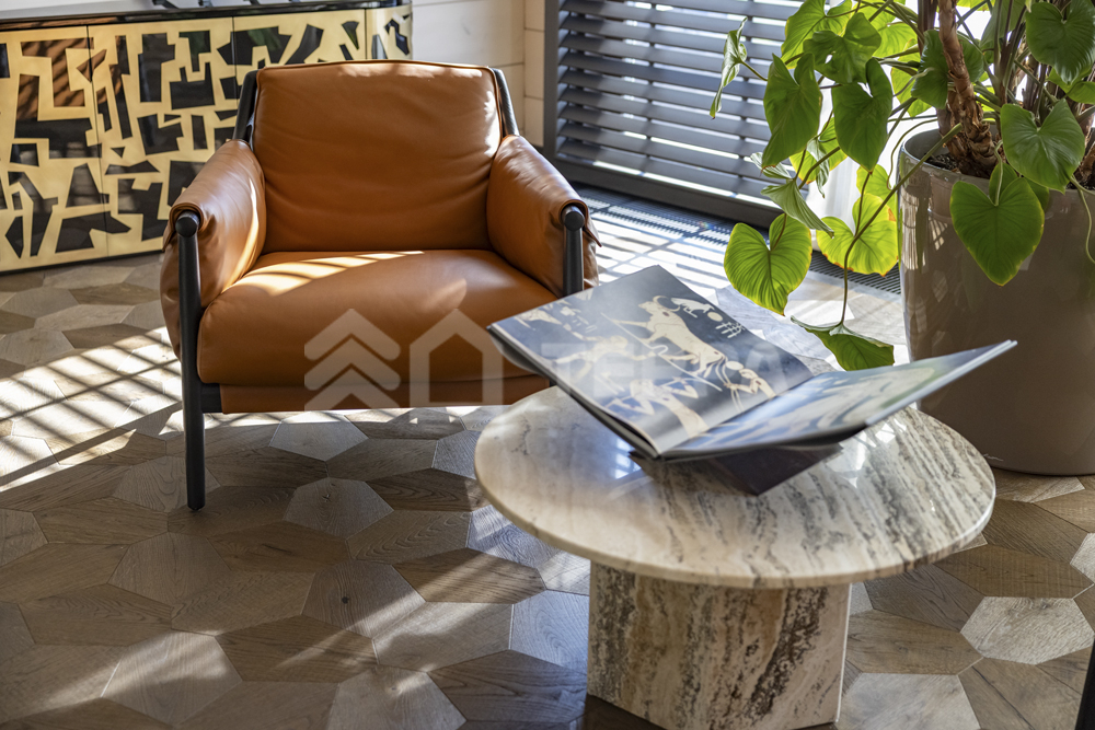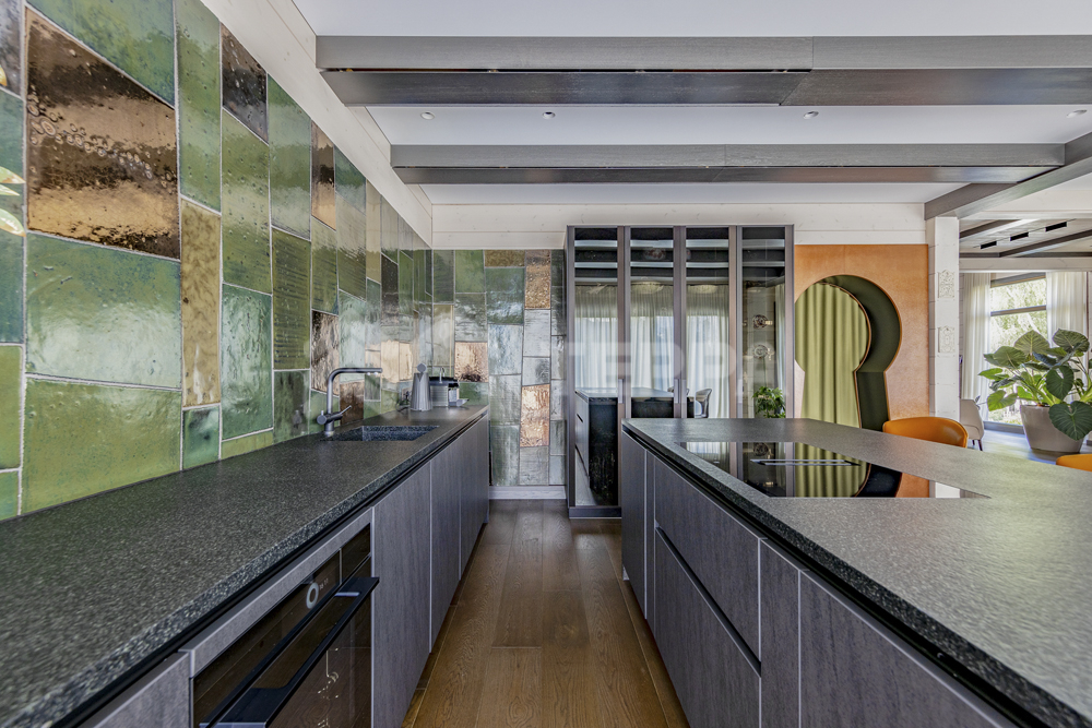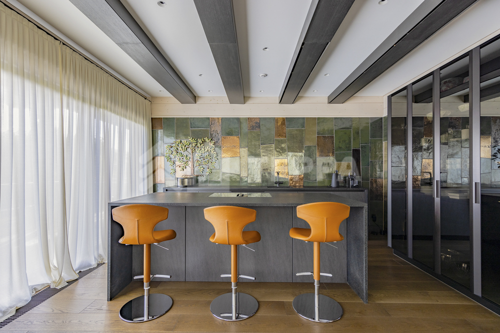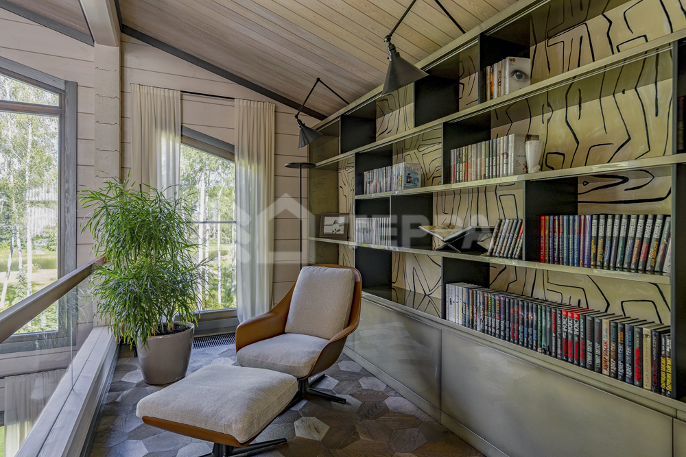 Интерьер дома воплощает стиль хюгге, наполненный уютом и теплом. Натуральные материалы, такие как мрамор Antique Brown и Black Storm, инженерная доска Либрон Arte Tech и мозаика Roma Diamond, сочетаются с мягкими оттенками. Сауну украшает канадский кедр и стена из гималайской соли. Необычные акценты, такие как дверной проем в форме замочной скважины и декоративные элементы, включая авторскую ширму с яблонями от Ольги Соловьевой, придают интерьеру уникальность и подчеркивают его природную концепцию.