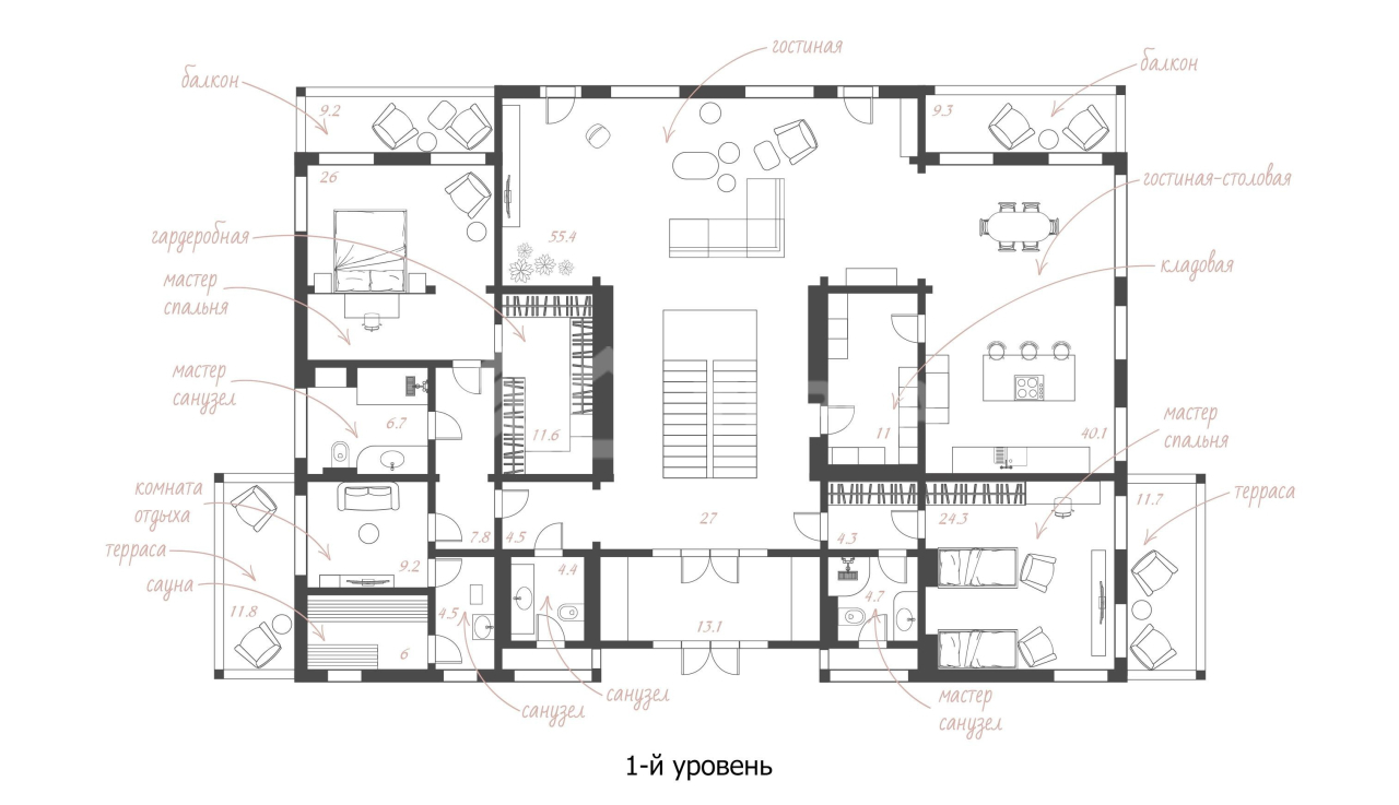 - мастер-спальня с кабинетом гардеробной санузлом и балконом