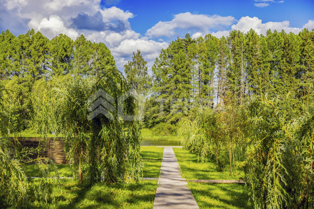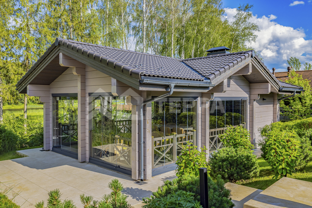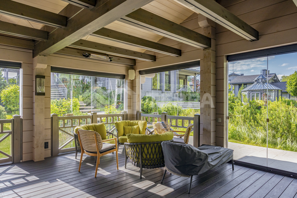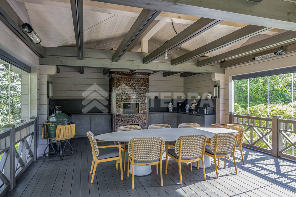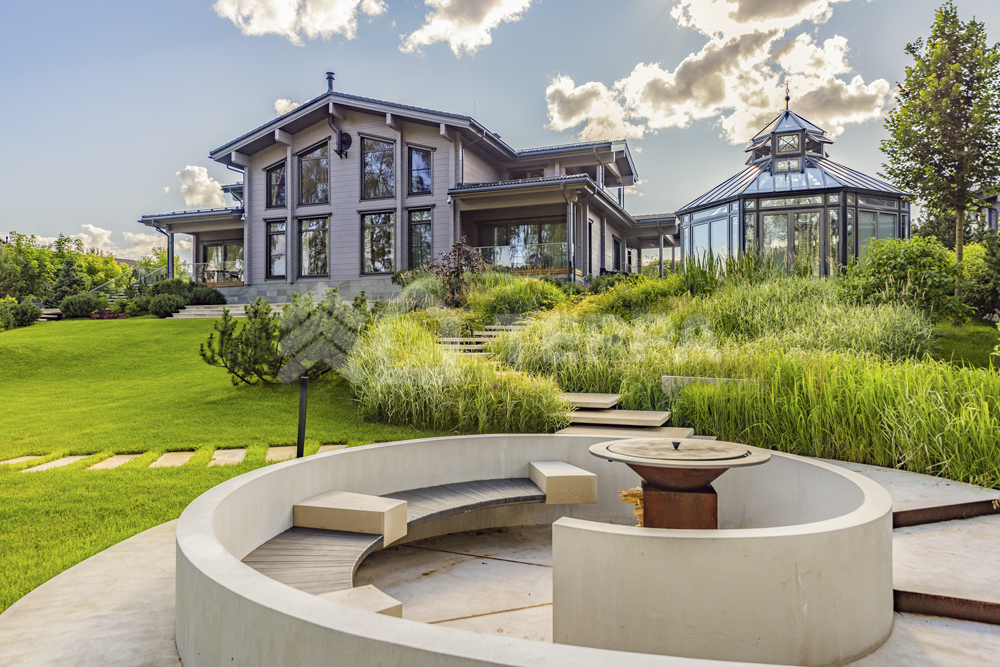 Территория дома утопает в зелени и плавных рельефах. Пространство тщательно организовано и продумано: стеклянный купол оранжереи, уютный павильон, аккуратная зона для огорода и оригинальное кострище в форме спирали создают гармонию с ухоженными газонами. Каменные дорожки изящно связывают различные локации, формируя единый ландшафт.