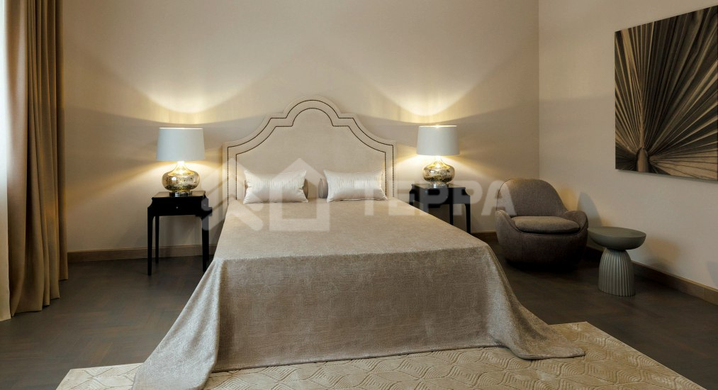 Легкость и уют пространству придают натуральные ткани: тактильно приятный лен, нежный хлопок и согревающая шерсть в шторах и аксессуарах. Приглушенное золотисто-янтарное освещение подчеркивает природную красоту фактур: тепло древесины прикроватных тумб, шероховатую нежность льняного балдахина, густой ворс ковра у кровати.