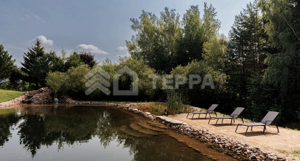 Естественный ландшафтный дизайн без строгой симметрии, с акцентом на вековой хвойный лес и реку, создает ощущение простора.