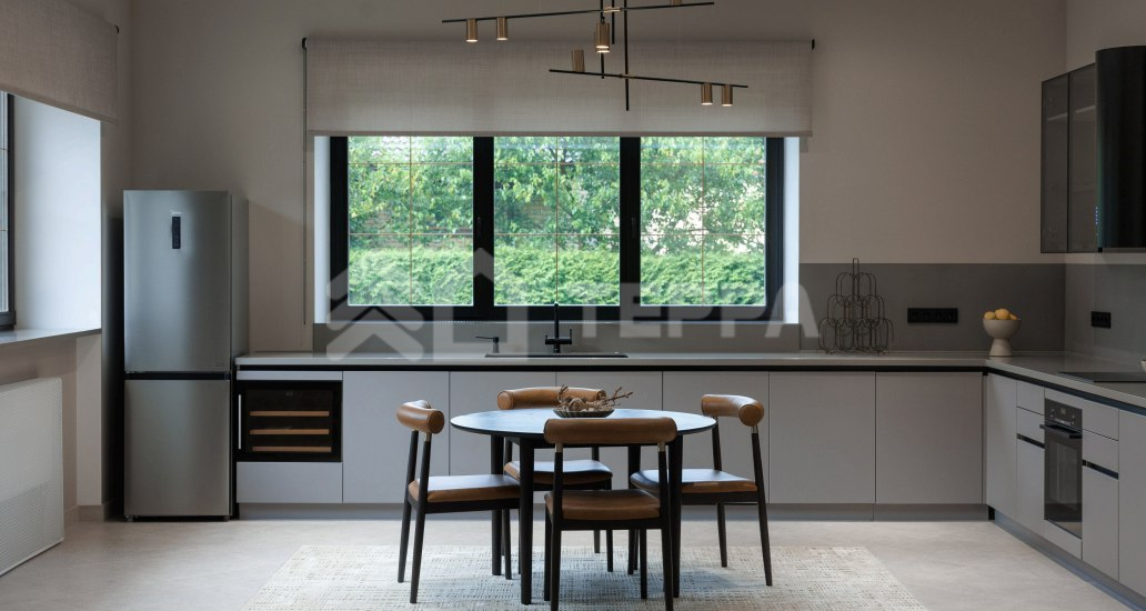 В интерьере дома активно используются натуральные фактуры и чистые линии. Эталон ухода от вычурности к простоте, функциональности и качеству. Природные оттенки бежевого, терракотового, оливкового, песочного и трюфельного создают атмосферу тепла, света и домашнего уюта.