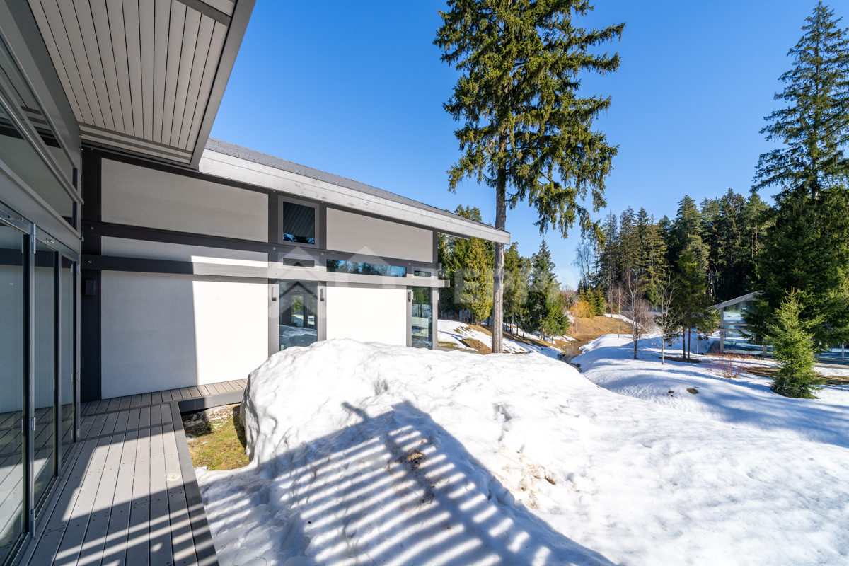 К дому пристроено вспомогательное строение площадью 150 квадратных метров, включающее в себя отапливаемый гараж и летнюю веранду с зоной для барбекю и выходом на живописный участок, обладающий естественным уклоном. У подножия участка тихо и спокойно протекает река Пересалька.