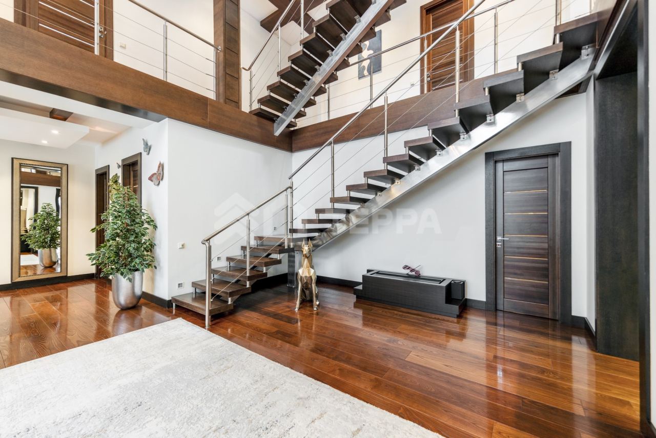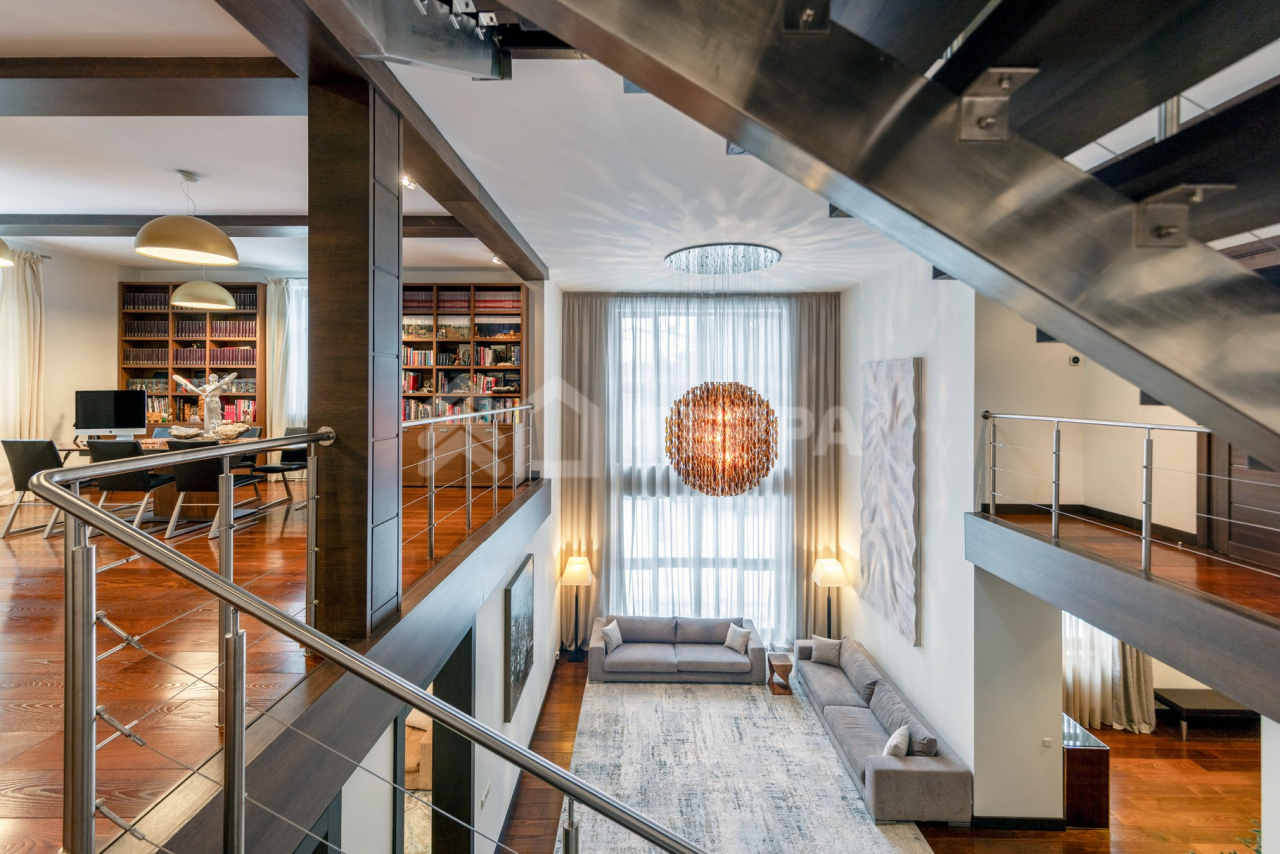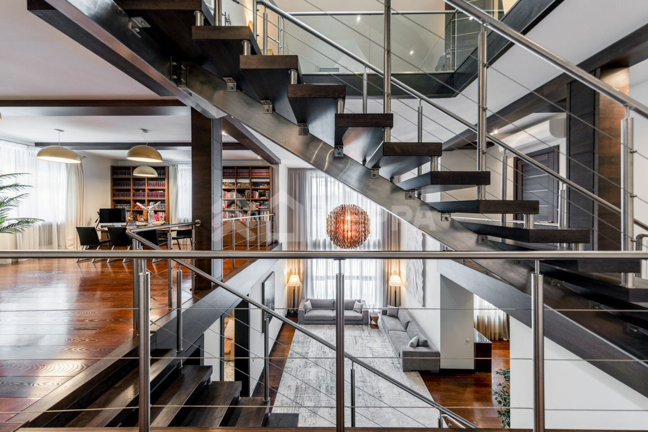 Дом общей площадью 650 кв. м расположен на участке 18 соток. Архитектурная идея построена на ощущении простора и естественного света: в доме реализован эффект второго света на всех уровнях, благодаря чему пространство выглядит особенно объемным и воздушным. Центральным акцентом интерьера стала эффектная «парящая» лестница - изящный архитектурный элемент, подчеркивающий современный характер резиденции. Сердцем дома является впечатляющая гостиная, вокруг которой выстроена вся внутренняя композиция пространства. Просторная, наполненная светом зона с высокими потолками и вторым светом создает атмосферу открытости и уюта одновременно. Планировочные решения продуманы до мелочей и создают баланс между общественными и приватными зонами. Особого внимания заслуживает мастер-зона: просторная мастер-спальня дополнена собственной гардеробной, ванной комнатой и будуаром. В доме также предусмотрена уютная библиотечная зона - идеальное пространство для чтения, работы и спокойного отдыха. На третьем этаже организована просторная детская территория - полноценное отдельное пространство для учебы, игр и отдыха. Гараж интегрирован в архитектурный контур здания, что обеспечивает максимальный комфорт в повседневной эксплуатации.