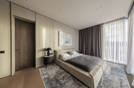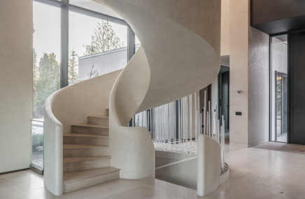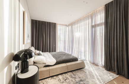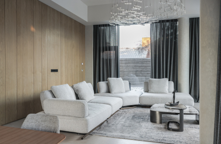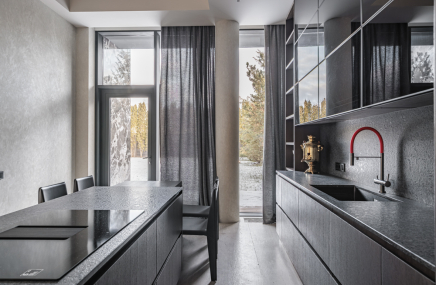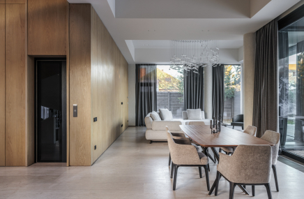 Среди особенностей дома: уютная гостиная с камином из оникса с подсветкой, современная кухня с выходом на террасу, 3 спальни и кабинет, 3 санузла, а также постирочная и гардеробная. Фасад из серого мрамора придаёт зданию особую элегантность.