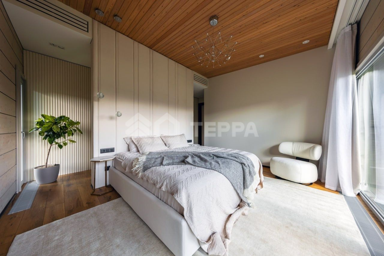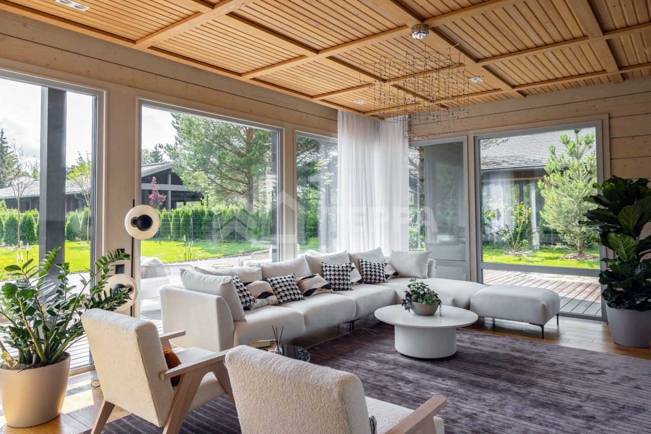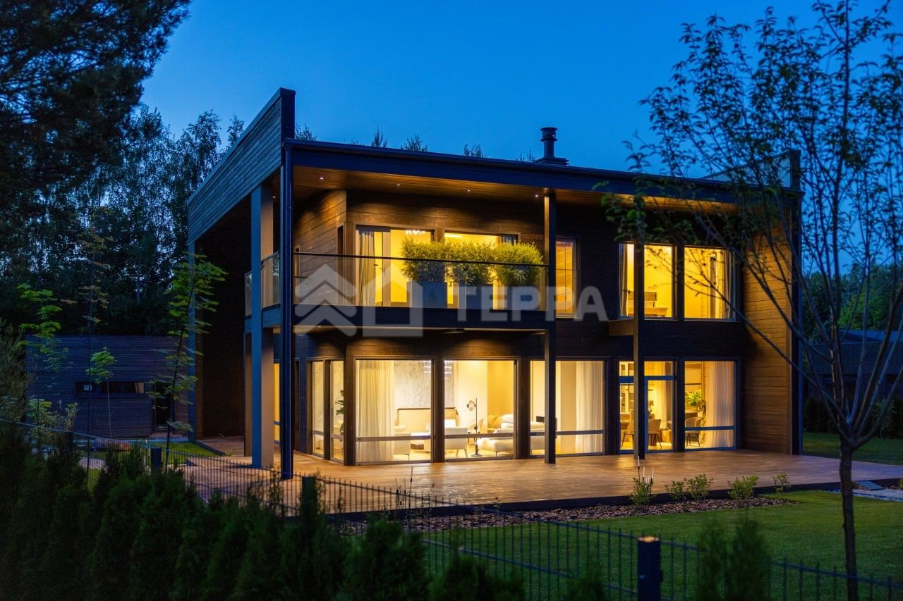 Двухэтажный дом премиум-класса в коттеджном поселке Gorki Lake спроектирован архитектором с мировым именем Matti Iiramo с учетом теневого проектирования. Дом построен из элитной финской ели по уникальной безусадочной технологии Nord Cross, единственной в России. Дом не требуют технического обслуживания, связанного с усадкой дома. Часть наружных стен выполнены из финских термо-модулей Concrette™, имеющих утепленную трехслойную бетонную структуру (технология разработана в Финляндии, имеет лучшие экологические и теплотехнические показатели, сегодня признана лучшей на рынке каменных домов). Дом утеплен по стандарту, превышающему СНиП в 1,5 раза. Панорамные двухкамерные алюминиевые энергоэффективные окна с климат контролем. Деревянные финские двери Kaski с системой климат-контроля. Итальянский стиль интерьера: дизайн и комплектация разработаны итальянским архитектором Fabiano Vidussi.