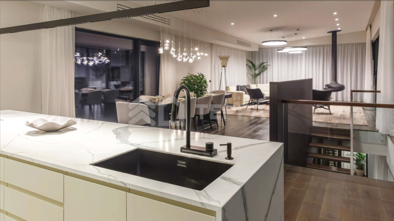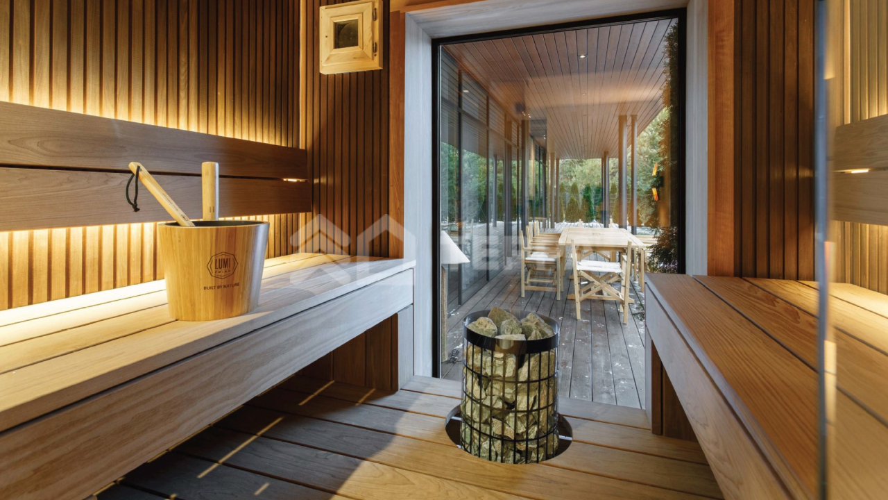 В доме воплощен принцип естественного света: панорамные энергосберегающие, дерево - алюминиевые окна с климат-контролем. Немецкий утеплитель из древесного волокна Gutex. На полу — натуральный паркет, под которым расположена массивная бетонная плита с интегрированной системой тёплого пола. Все отопление подключено к системе удалённого управления: температуру можно настраивать со смартфона. Умный дом HitePro с возможностью управлять освещением, шторами, гаражными воротами. Система видеонаблюдения на базе программного обеспечения Hikvision с возможностью наращивания количества видеокамер, архив записей до 30 дней, просмотр камер в режиме реального времени с мобильного устройства и планшета, прием звонков с домофона с возможностью открытия калитки с телефона. Современная система беспроводной пожарной сигнализации Аргус-Спектр с возможностью контроля датчиков через приложение. Полное бесшовное покрытие Wi-Fi нового поколения, с возможностью управления сетью через облачный контролер OmadaTP-Link.