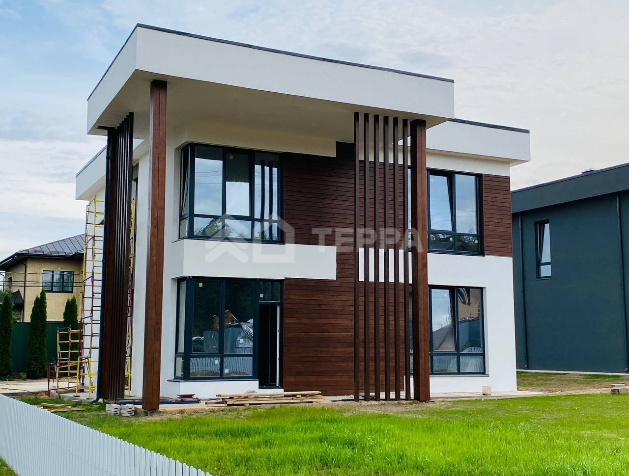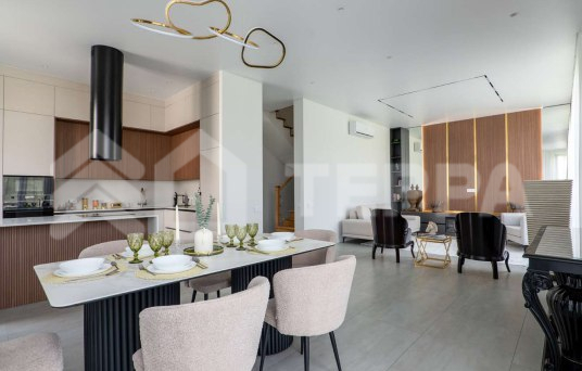 Дом современной, модной инфраструктуры, выполнен актуальный авторский дизайн в стиле contemporary. Фасад дома выполнен из сочетания декоративной штукатурки белого цвета и планкена из лиственницы. Такая комбинация придает дому законченный и благородный вид. Дом подключен ко всем инженерным коммуникациям: магистральный газ, электричество 15 кВт, скважина, канализация - локальные мини очистные. На первом этаже прихожая, гостевая спальня со своими санузлом, которую при желании можно превратить в рабочий кабинет. Под лестницей размещена просторная постирочная. Кухня с кладовой, столовая с выходом на террасу и светлая гостиная. В помещении с отдельным входом расположена газовая котельная.